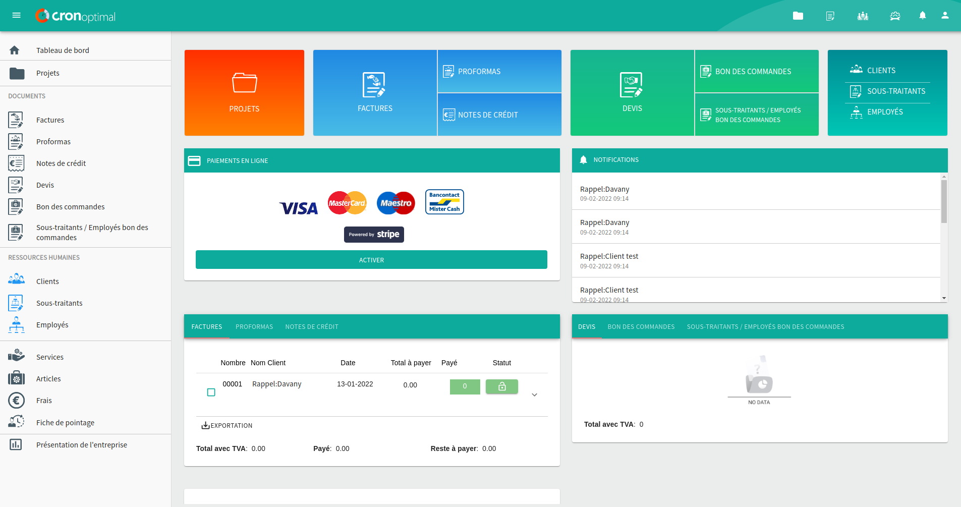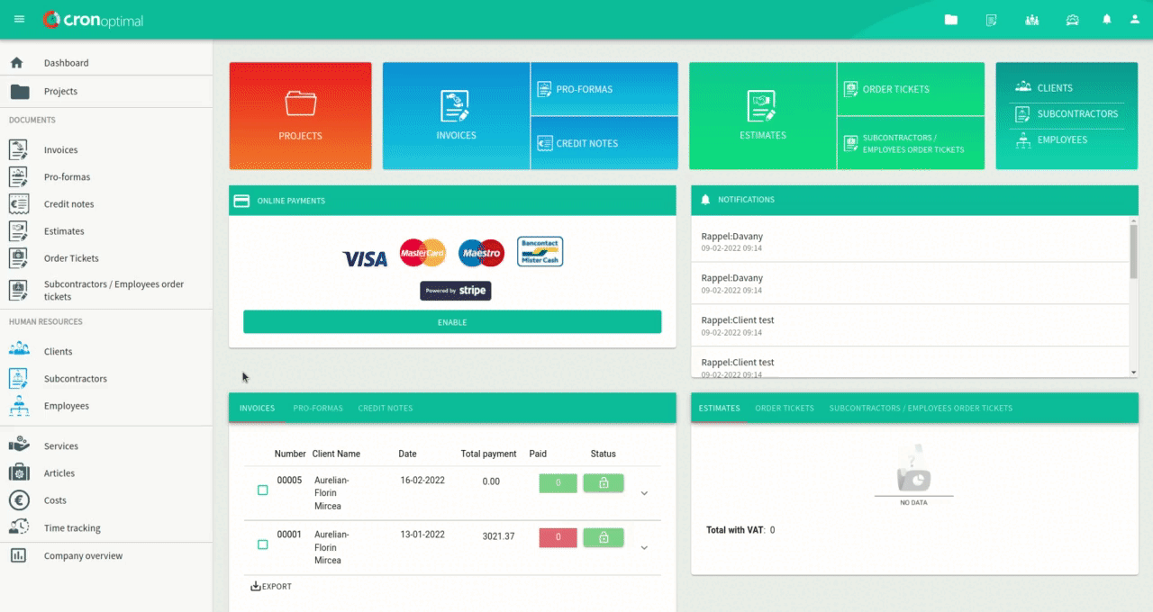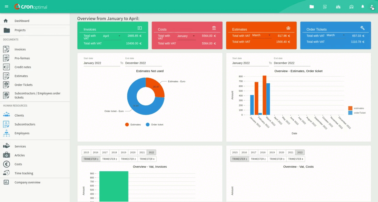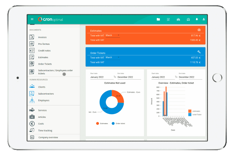 CronOptimal est très simple et intuitif. Vous vous sentirez immédiatement à l’aise avec notre interface utilisateur. Préparez-vous à vous concentrer enfin sur votre activité, car toutes les longues et fatigantes formalités administratives sont terminées !